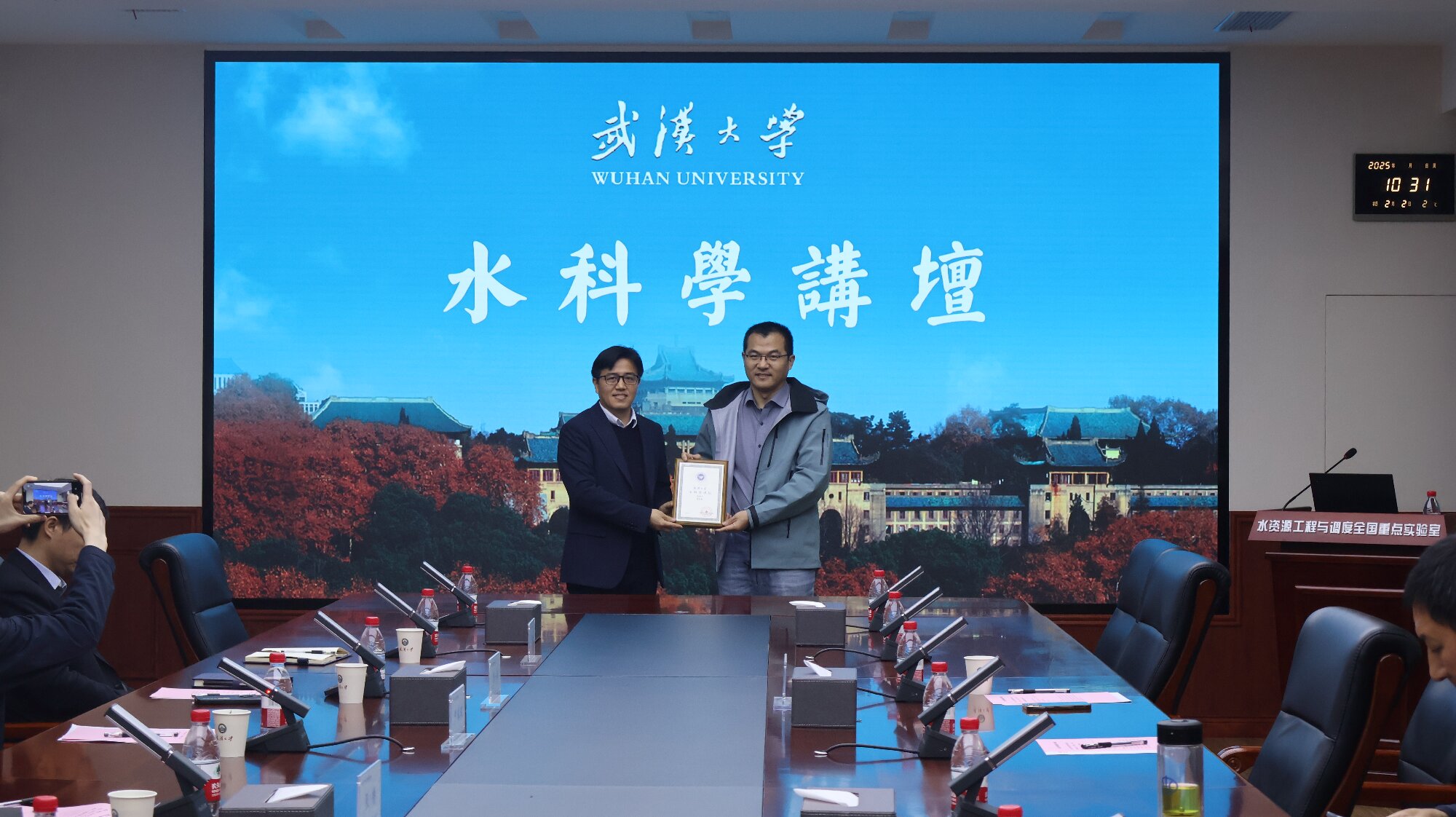 陈杰副主任授予高红凯教授“武汉大学水科学讲坛”纪念牌