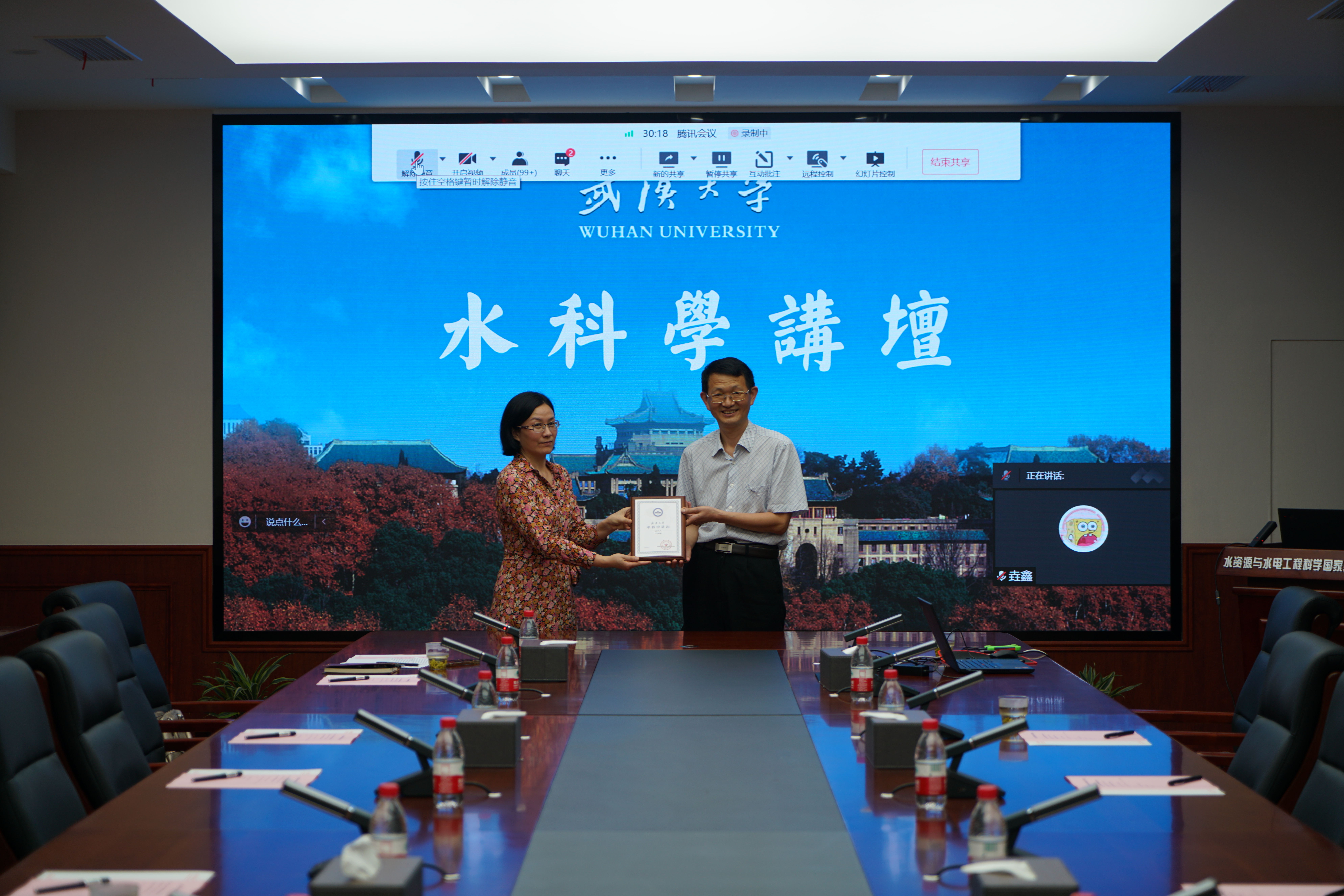 曾玉红副主任授予王洪铸研究员“武汉大学水科学讲坛”纪念牌