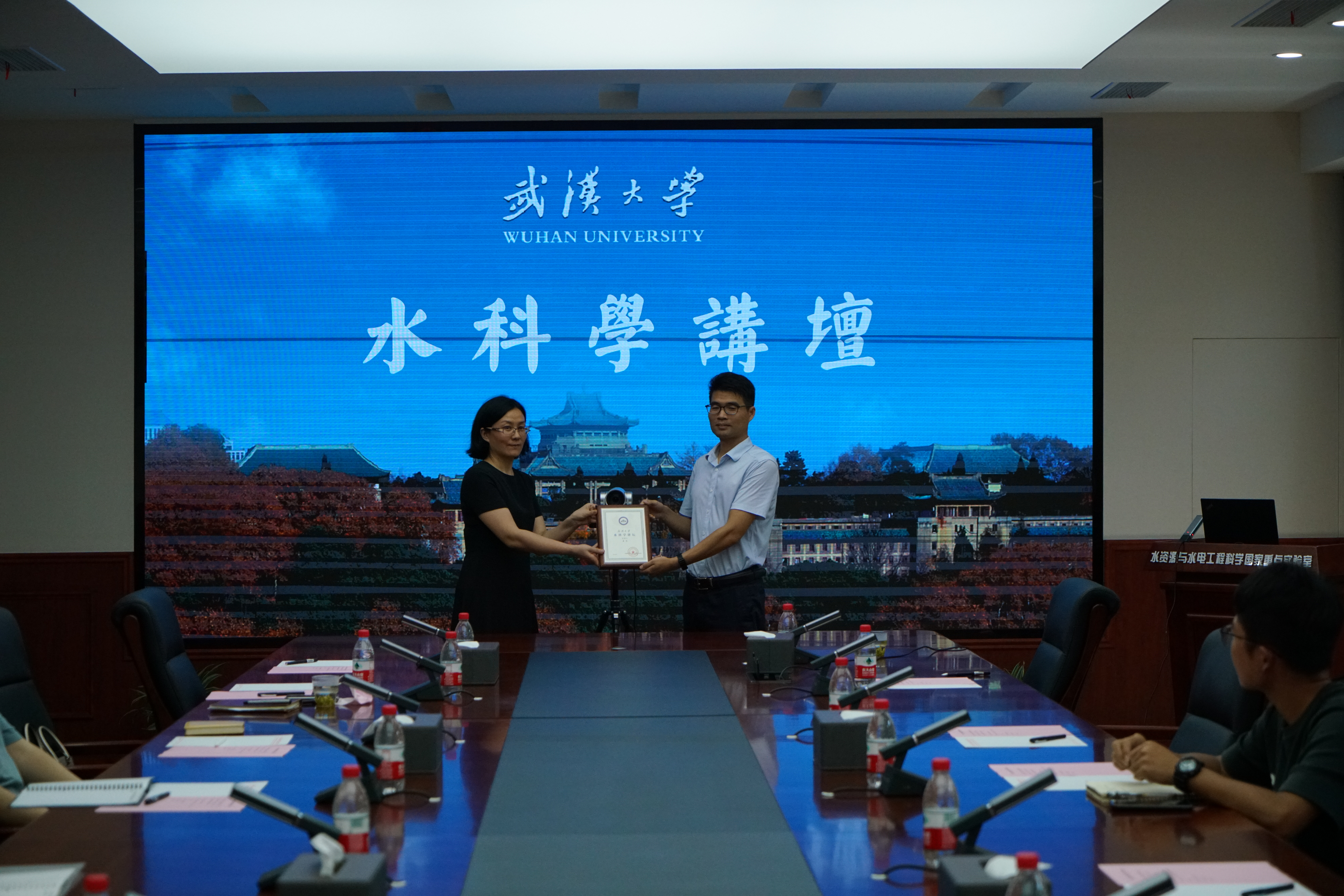 曾玉红副主任授予姜伟教高“武汉大学水科学讲坛”纪念牌