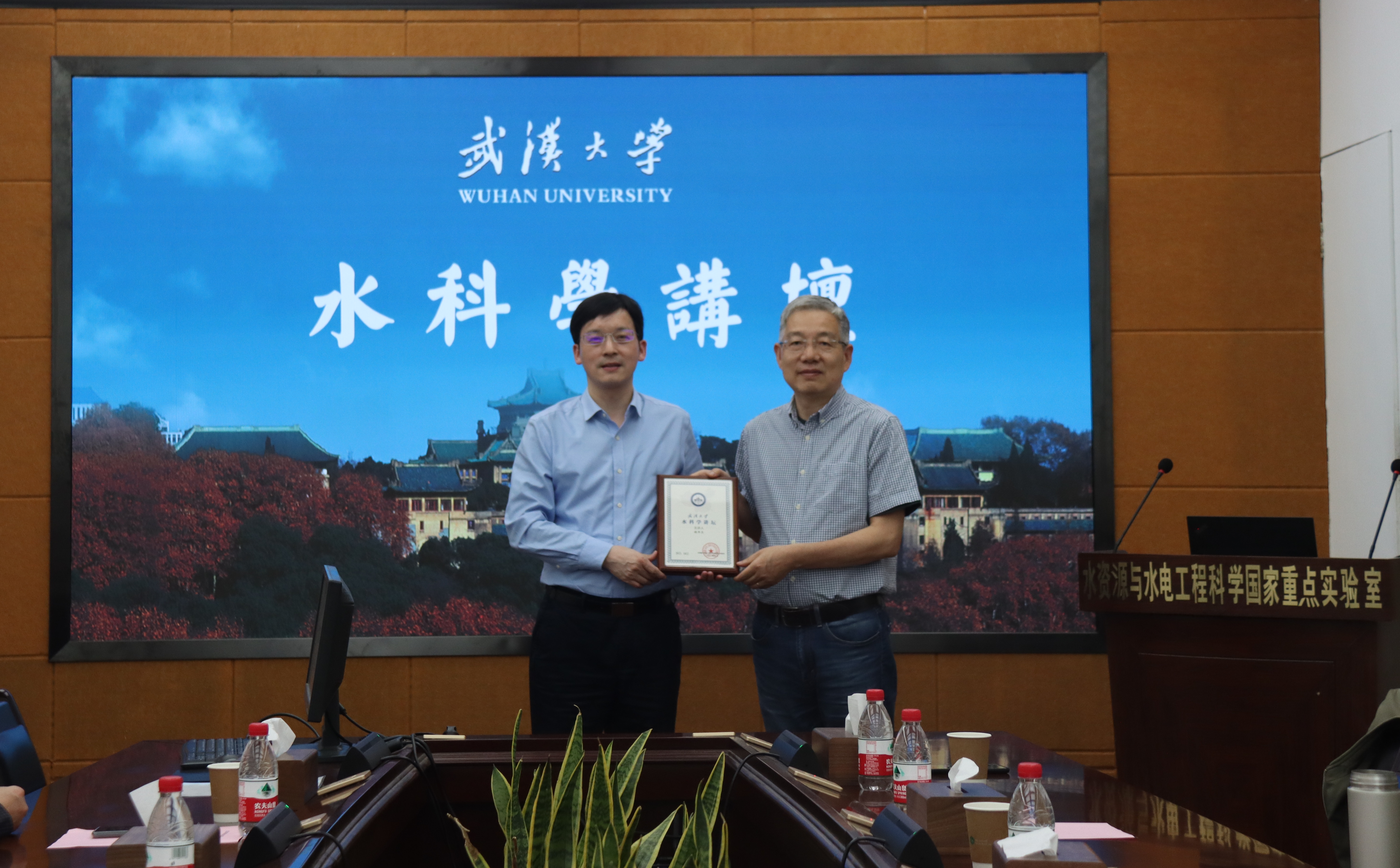 李典庆主任授予程年生教授“武汉大学水科学讲坛”纪念牌
