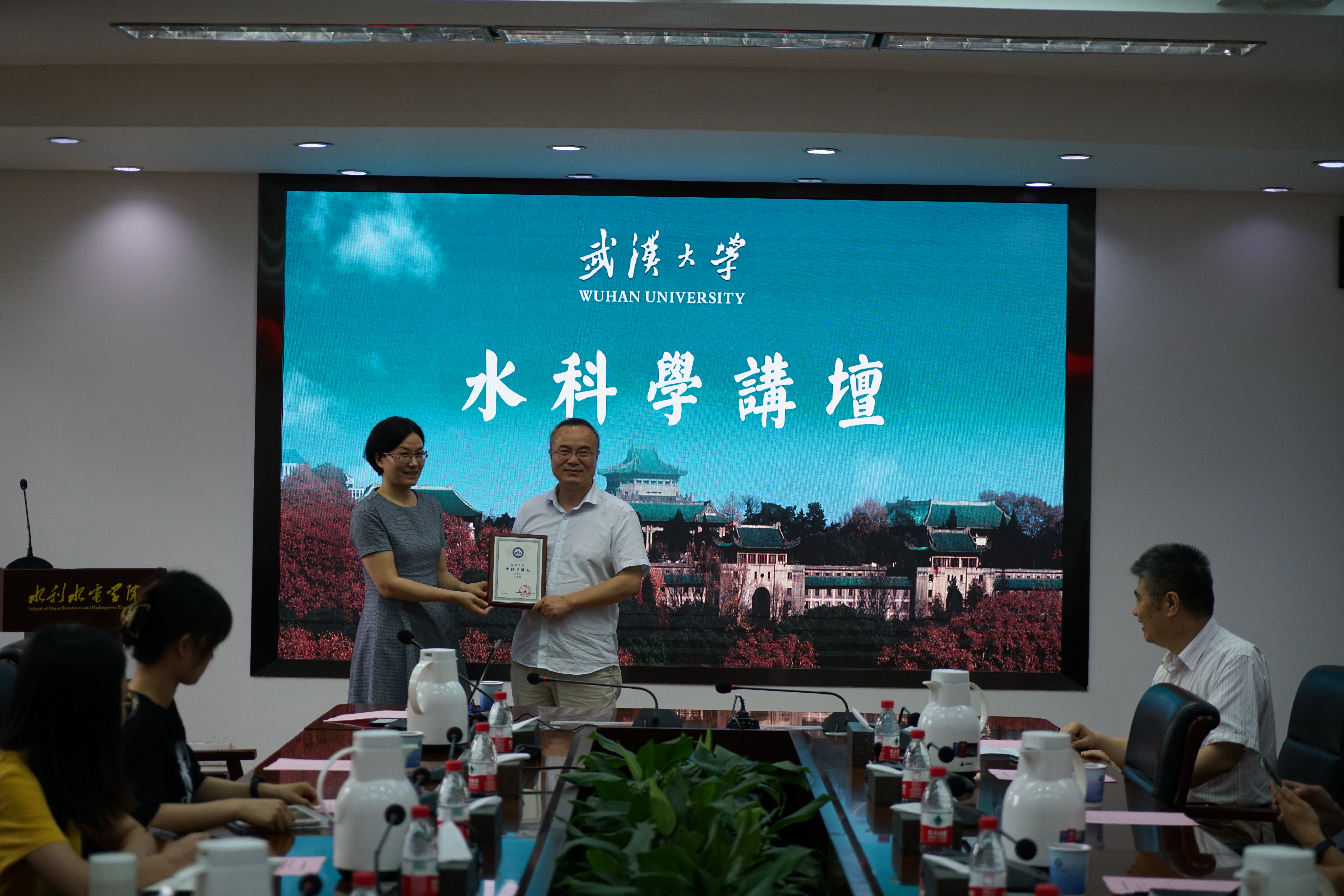 曾玉红副主任授予卢东强研究员“武汉大学水科学讲坛”纪念牌