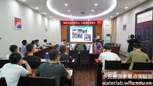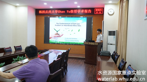 2019年6月27日,应伍靖伟教授邀请,韩国庆尚大学Chan Yu教授访问实验室,并作了题为“矿山修复中土壤流失问题的对策(The countermeasure of soil loss mitigation from abandoned mine sites remediated)”的学术报告。