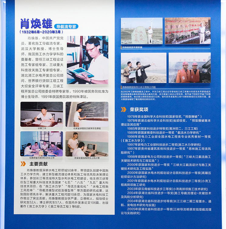 我国施工水力学学科的奠基者。曾任三峡工程论证施工专家组专家、三峡重大科技攻关施工专家组专家等。肖焕雄教授深耕水电工程领域50余年,带领团队创建中国施工水力学方向,建立新型截流理论体系和施工导流风险决策理论体系,先后参加长江、黄河、珠江等流域上众多特大型水利水电工程建设。作为三峡工程论证专家组和三峡工程重大科技攻关专家组成员,从1993年开始便围绕三峡工程中出现的技术难题进行技术攻关,为三峡工程的顺利建成做出了巨大贡献,他的许多研究成果在大江截流蓄水过程中得到了应用和验证。