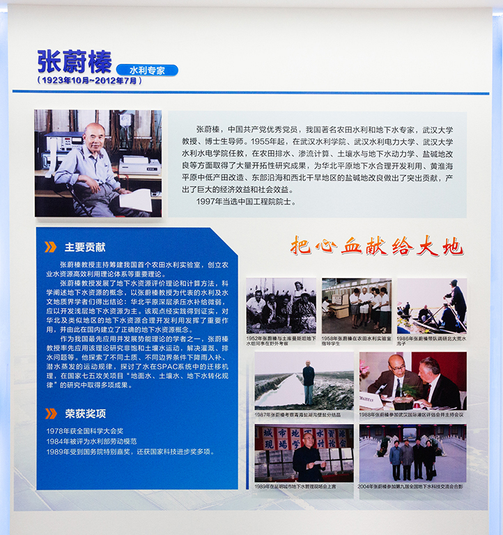 张蔚榛院士,是我国著名农田水利和地下水专家,在农田排水、渗流计算、土壤水与地下水动力学、盐碱地改良等方面取得了大量开拓性研究成果。张蔚榛教授主持筹建我国首个农田水利实验室,创立农业水资源高效利用理论体系等重要理论。他发展了地下水资源评价理论和计算方法,科学阐述地下水资源的概念,并由此在国内建立了正确的地下水资源概念。作为我国最先应用并发展势能理论的学者之一,张蔚榛教授率先应用该理论研究非饱和土壤水运动,解决灌溉、排水问题等。