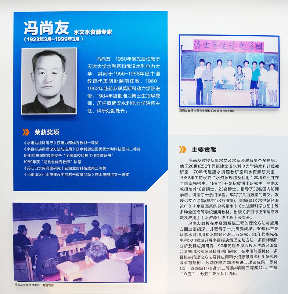 冯尚友教授从事水文及水资源教育半个多世纪。他于上世纪组建武汉水利电力学院水利计算教研室、水资源教研室和水资源研究室,1982年主持设立“水资源规划及利用”本科专业并在全国率先招生。冯尚友教授在水资源系统工程的理论方法与应用方面造诣颇深, 60年代主要从事水能利用和水电站经济运行研究,80年代率先在水利水电领域开展多目标决策理论与方法、多目标递阶分析及其应用研究,90年代起全身心投入生态经济复合系统和水资源可持续利用研究。在水电能源优化、多目标决策理论方法及其应用和水资源可持续利用研究领域卓有建树。