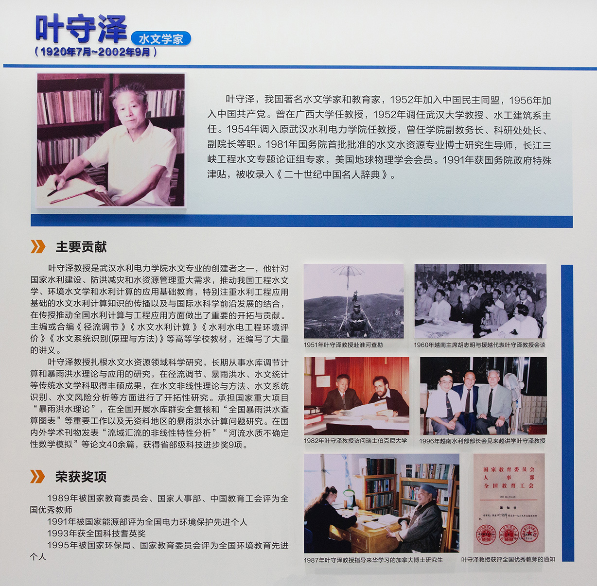 我国著名水文学家和教育家,是学院水文专业的创建者之一。叶守泽教授长期从事水库调节计算和暴雨洪水理论与应用的研究,在径流调节、暴雨洪水、水文统计等传统水文学科取得丰硕成果,在水文非线性理论与方法、水文系统识别、水文风险分析等方面进行了开拓性研究。