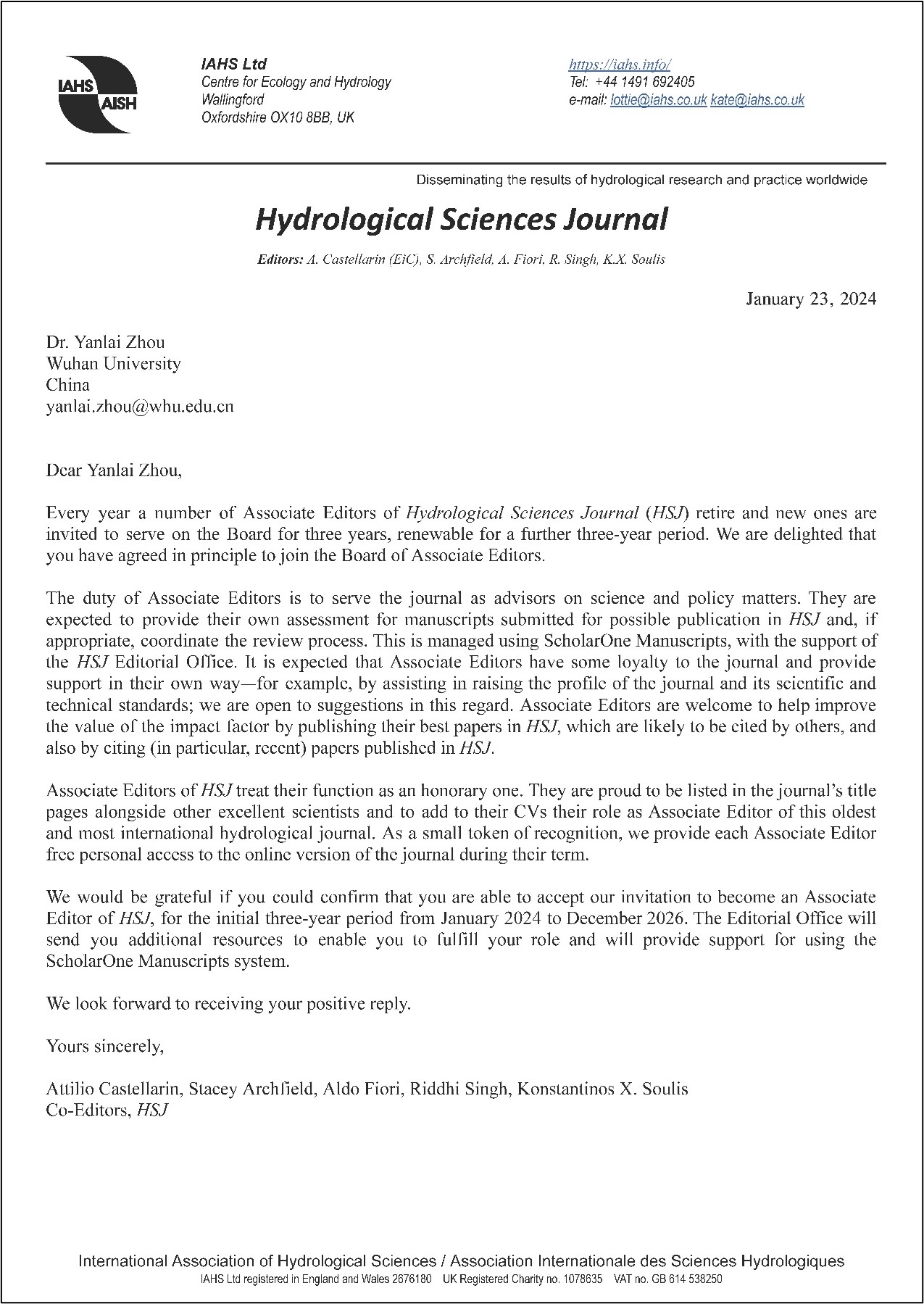 近日,水资源工程与调度全国重点实验室、水利水电学院周研来教授受国际水文科学协会(International Association of Hydrological Sciences,IAHS)官方期刊水文科学杂志(Hydrological Sciences Journal,HSJ)主编Attilio Castellarin教授邀请,担任HSJ的副主编(Associate Editor),任期三年(2024~2026)。