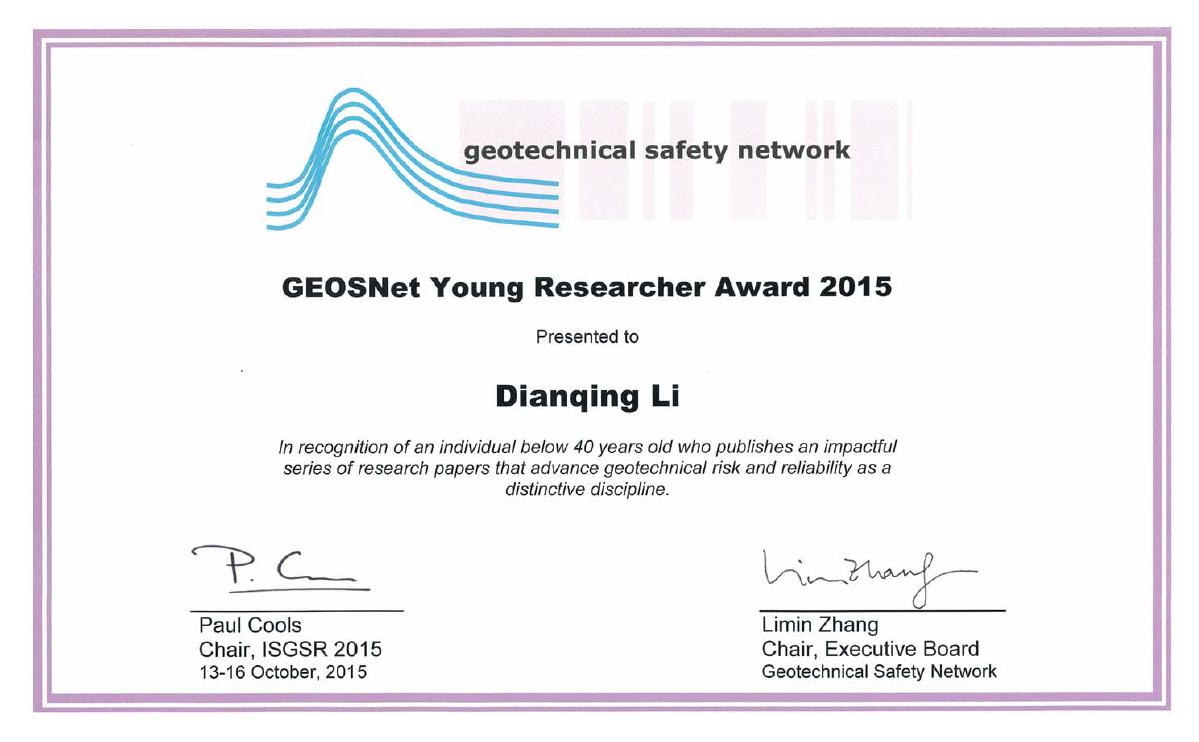 日前,第五届国际岩土工程安全与风险会议在荷兰召开,李典庆教授获2015年度国际岩土工程安全协会颁发的青年科学家奖(GEOSNet Young Researcher Award),奖项表彰词为:In recognition of an individual below 40 years old who publishes an impactful series of research papers that advance geotechnical risk and reliability as a distinctive discipline。这标志着李典庆教授在水利水电岩土工程可靠度分析与风险控制方面的研究得到国际同行的普遍认可。