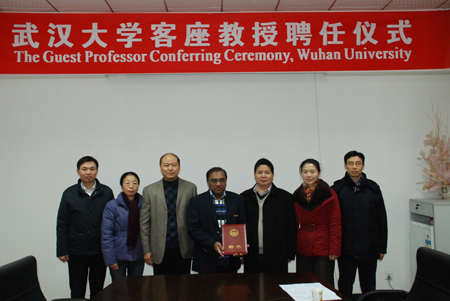 2010年12月13-15日,美国亚利桑那大学Pinnaduwa H.S.W. Kulatilake教授访问实验室并授聘为武汉大学客座教授。聘任仪式由实验室学术带头人陈胜宏教授主持,徐青博士介绍了Kulatilake教授的基本情况,武汉大学校长助理、实验室主任谈广鸣教授对Kulatilake教授的来访表示欢迎,并颁发聘书;Kulatilake教授表示,能授聘为武汉大学客座教授感到十分高兴,并考虑授聘为实验室流动研究人员,每年定期到实验室进行合作研究。访问期间,Kulatilake教授作了“三维随机岩体裂隙几何模拟:REV尺度和水力传导矩阵评估(Stochastic fracture geometry modeling in 3-D including validations and estimation of REV size and three dimensional hydraulic conductivity tensor for a fractured rock mass through discrete fracture fluid flow modeling)”学术报告,并参观了实验室。